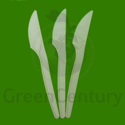 EcoCentury® - This cutlery is made from pure plant starch materials. It is a fermented sugar extract taken from the residual stalks and leaf materials from corn, wheat, and rice farming. It contains no chemical hardening agents or crystalline agents. This product is an organic product performing at the highest standard for any pure Bio plastic available.